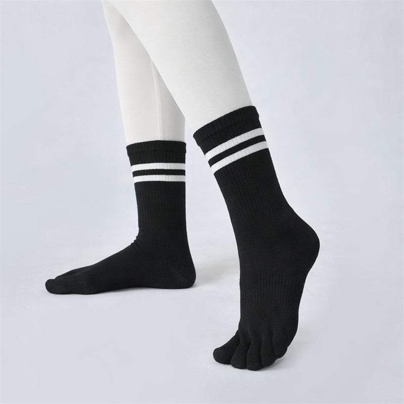 Purple socks with toe separation on a neutral background